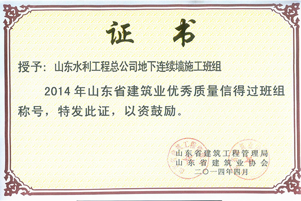 公司“地下連續(xù)墻施工班組”榮獲2014年山東省建筑業(yè)優(yōu)秀質量信得過班組稱號