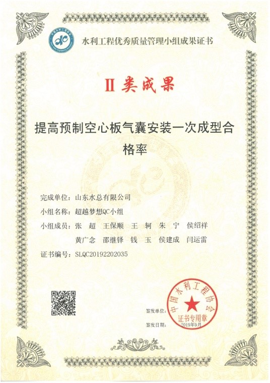 2019年9月24日,由中國水利工程協(xié)會舉辦的2019年度中國水利工程優(yōu)秀質(zhì)量管理小組成果發(fā)布,山東水總有限公司報送的《提高碾壓混凝土壩溫控效率》和《提高預(yù)制空心板氣囊安裝一次成型合格率》2項成果全部獲Ⅱ類成果獎。