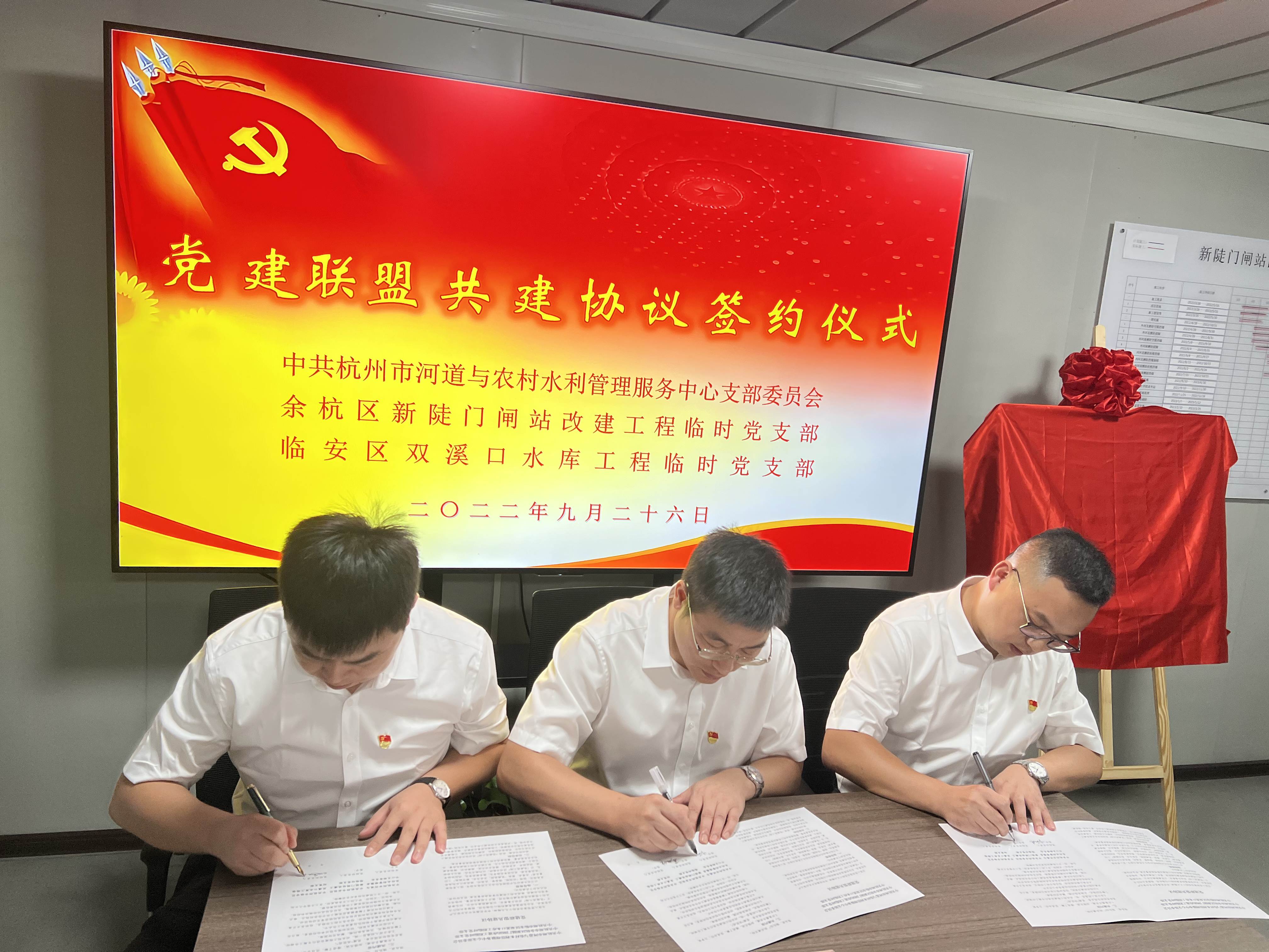 9月26日,中共杭州市河道與農(nóng)村水利管理服務中心支部委員會、中共杭州市余杭區(qū)新陡門閘站改建工程臨時黨支部、中共杭州市臨安區(qū)雙溪口水庫工程臨時黨支部在新陡門閘站改建工程現(xiàn)場舉行黨建聯(lián)建協(xié)議簽約儀式。市農(nóng)水中心支部書記、主任葉利偉,余杭區(qū)林水局黨委委員、二級調(diào)研員徐偉林,臨安水利局機關黨委副書記、紀檢書記劉勇,新陡門閘站改建工程臨時黨支部書記葛旭峰,雙溪口水庫工程臨時黨支部書記孟天琦及各支部代表參加簽約活動。