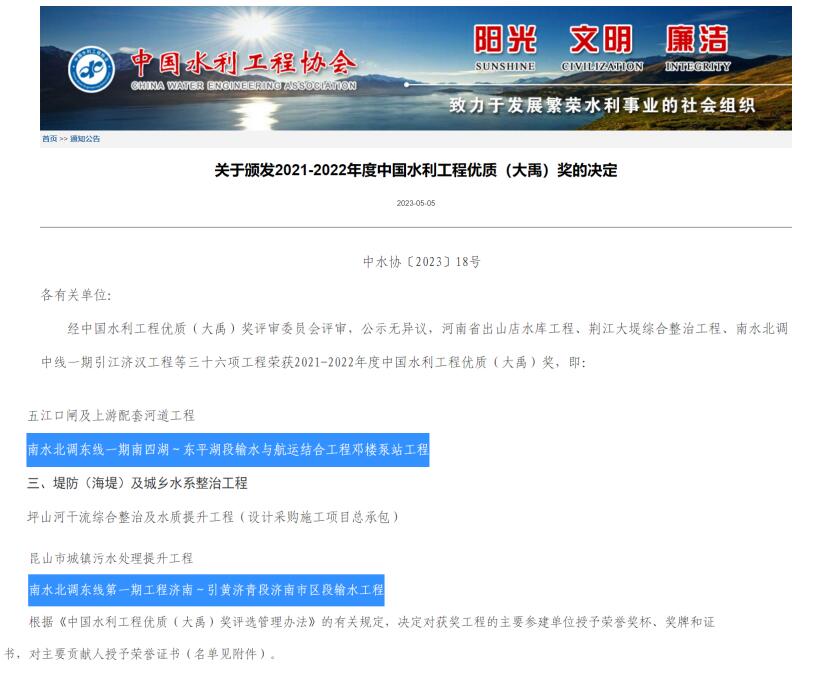 近日,中國水利工程協(xié)會發(fā)布《關(guān)于頒發(fā)2021-2022年度中國水利工程優(yōu)質(zhì)(大禹)獎的決定》,我公司參建的南水北調(diào)東線第一期工程濟(jì)南~引黃濟(jì)青段濟(jì)南市區(qū)段輸水工程和南水北調(diào)東線一期南四湖~東平湖段輸水與航運(yùn)結(jié)合工程鄧樓泵站工程榮獲此項(xiàng)殊榮。