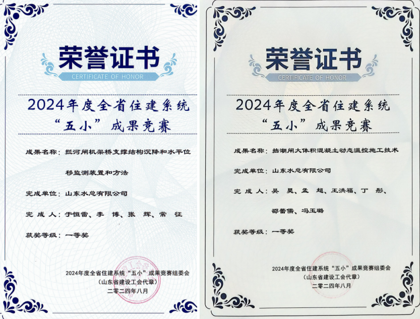 近日,由山東省建設(shè)建材工會和山東省建設(shè)科技與教育協(xié)會組織的2024年度全省住建系統(tǒng)“五小”成果競賽發(fā)布獲獎名單,公司申報(bào)的《擋潮閘大體積混凝土動態(tài)溫控施工技術(shù)》、《攔河閘機(jī)架橋支撐結(jié)構(gòu)沉降和水平位移檢測裝置和方法》等8項(xiàng)創(chuàng)新成果分別榮獲一等獎2項(xiàng),二等獎2項(xiàng),三等獎4項(xiàng)。