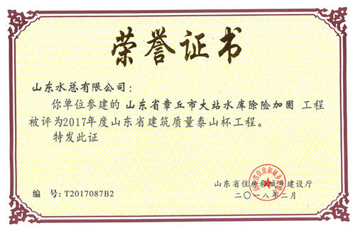 公司“山東省章丘市大站水庫除險加固工程”榮獲2017年度山東省建筑質(zhì)量泰山杯