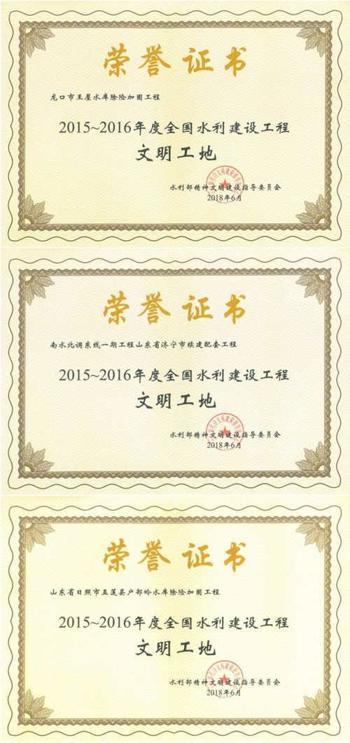 公司“龍口市王屋水庫除險加固工程”等項目榮獲“2015-2016年度全國水利建設(shè)工程文明工地”稱號