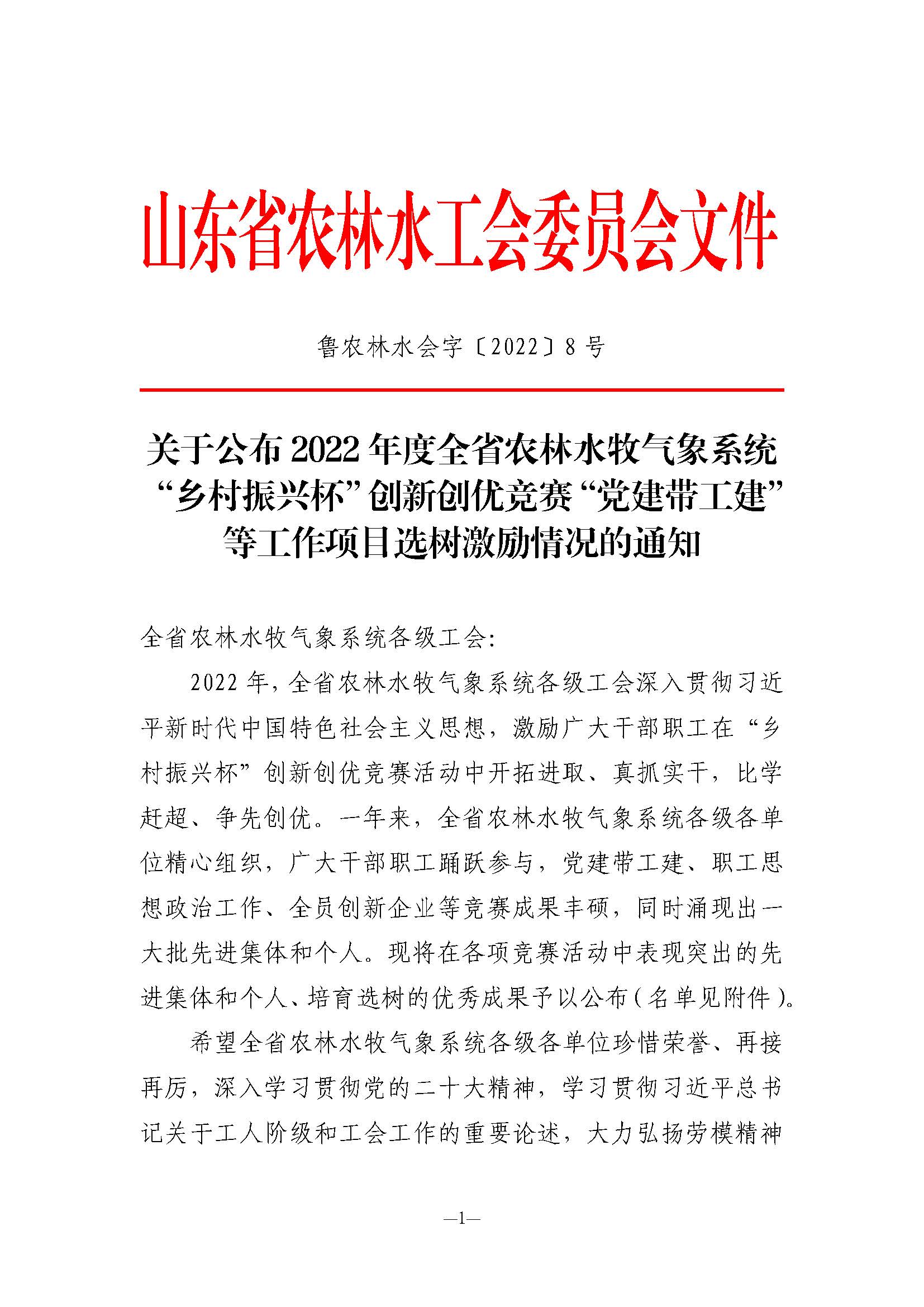 近日,山東省農(nóng)林水工會(huì)委員會(huì)下發(fā)《關(guān)于公布2022年度全省農(nóng)林水牧氣象系統(tǒng)“鄉(xiāng)村振興杯”創(chuàng)新創(chuàng)優(yōu)競(jìng)賽等工作項(xiàng)目選樹(shù)激勵(lì)情況的通知》,對(duì)涌現(xiàn)出的先進(jìn)集體、個(gè)人和優(yōu)秀案例予以通報(bào)表?yè)P(yáng)。第六分公司報(bào)送的《以“黨建+”系列活動(dòng)為抓手 實(shí)施“黨建帶工建項(xiàng)目化”管理》和基礎(chǔ)公司報(bào)送的《黨建帶工建 攜手共建》兩個(gè)案例榮獲“黨建帶工建、工建促黨建”優(yōu)秀案例;第二分公司報(bào)送的《堅(jiān)持以人為本 結(jié)合實(shí)際開(kāi)展職工思想政治工作》榮獲“職工思想政治工作”優(yōu)秀案例;劉永恩同志榮獲第二屆“身邊的愛(ài)崗敬業(yè)榜樣”;蘇強(qiáng)、謝金虎、李云賀同志榮獲“職工安全隱患排查競(jìng)賽優(yōu)秀個(gè)人”。