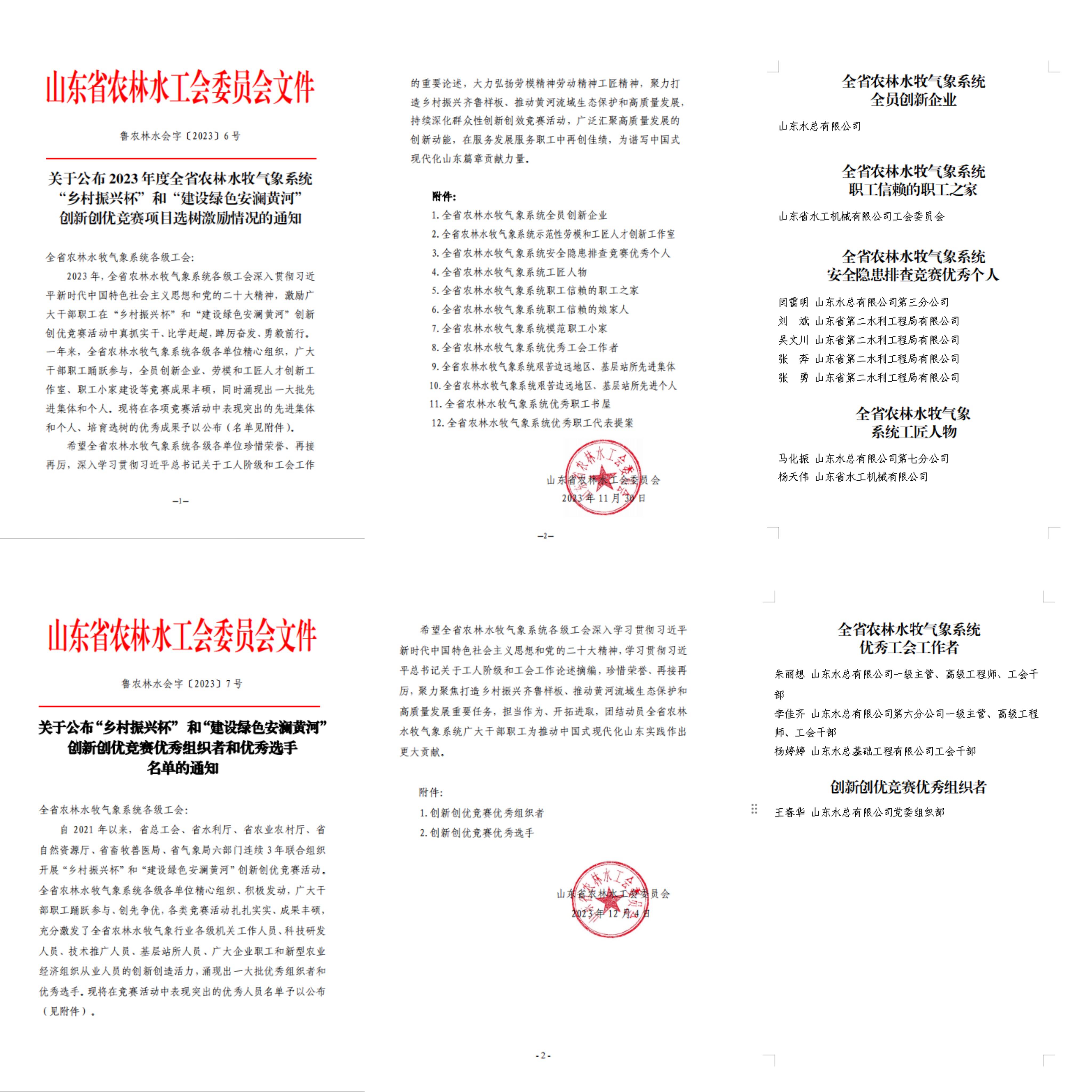 近日,山東省農(nóng)林水工會下發(fā)了《關(guān)于公布 2023 年度全省農(nóng)林水牧氣象系統(tǒng)“鄉(xiāng)村振興杯”和“建設(shè)綠色安瀾黃河”創(chuàng)新創(chuàng)優(yōu)競賽項(xiàng)目選樹激勵情況的通知》《“鄉(xiāng)村振興杯” 和“建設(shè)綠色安瀾黃河”創(chuàng)新創(chuàng)優(yōu)競賽優(yōu)秀組織者和優(yōu)秀選手名單的通知》,山東水總榮獲全省農(nóng)林水牧氣象系統(tǒng)全員創(chuàng)新企業(yè),水工機(jī)械公司工會榮獲“職工信賴的職工之家”,11人分別榮獲“職工安全隱患排查競賽優(yōu)秀個人”“工匠人物”“優(yōu)秀工會工作者”“創(chuàng)新創(chuàng)優(yōu)競賽優(yōu)秀組織者”等稱號。
